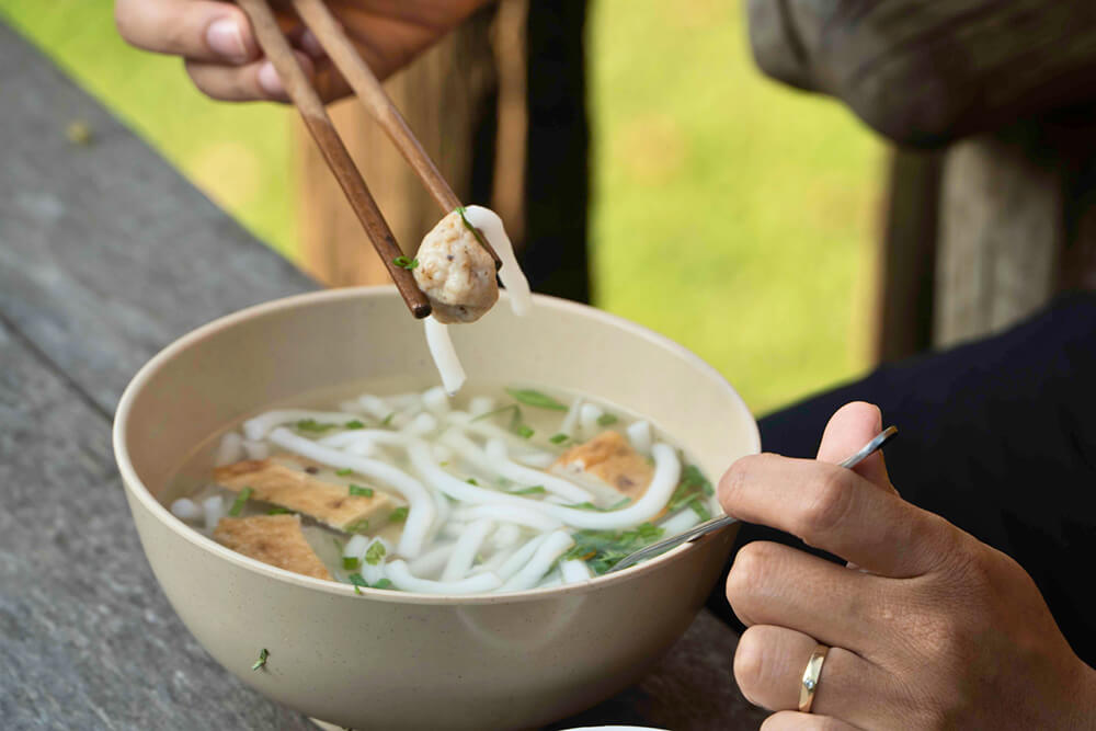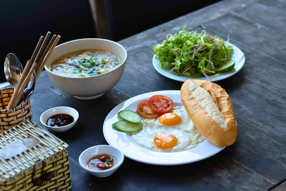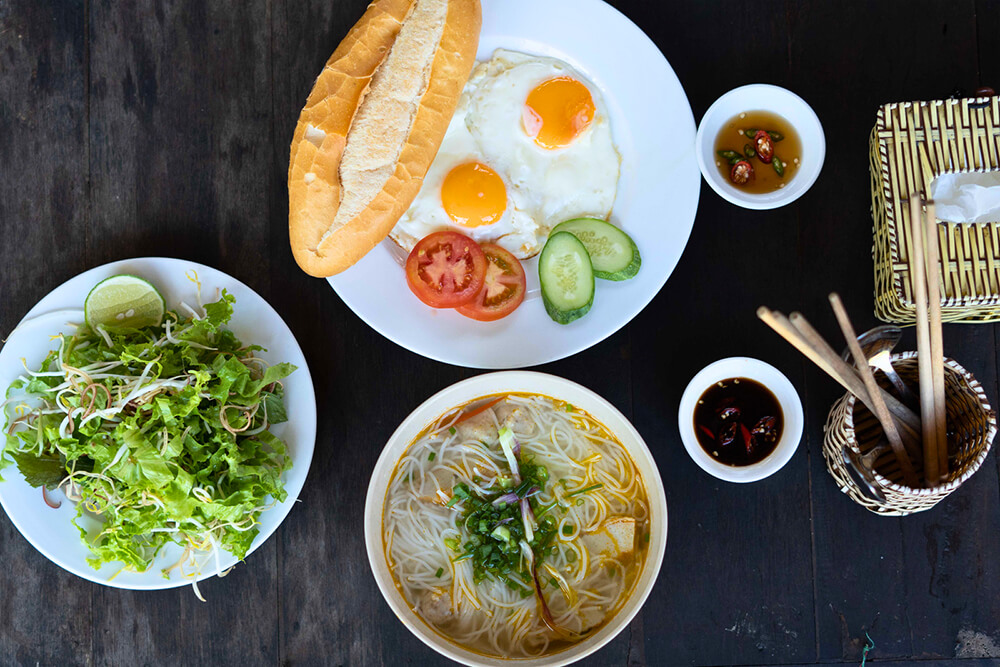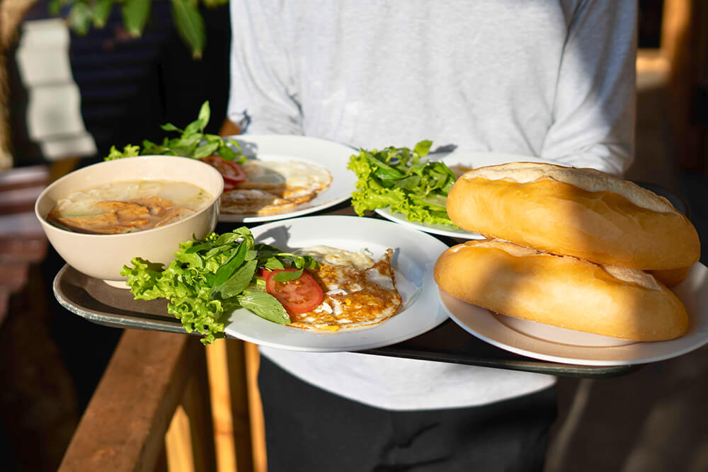 Điểm tâm sáng có mì xào, phở, bánh canh, bún bò,… tuỳ ngày.