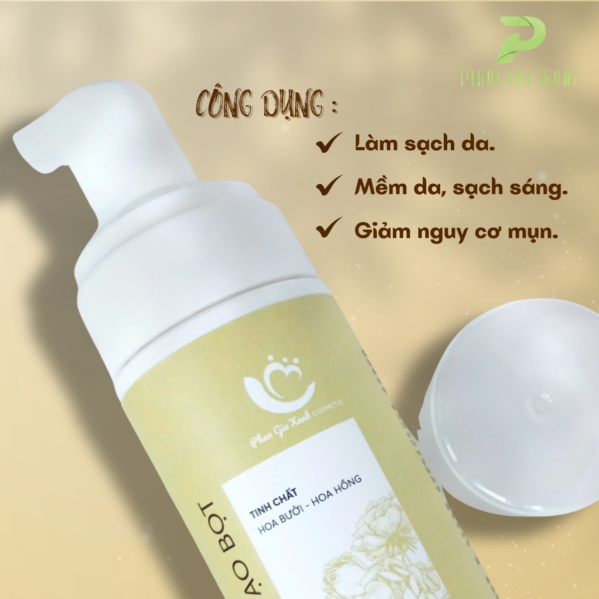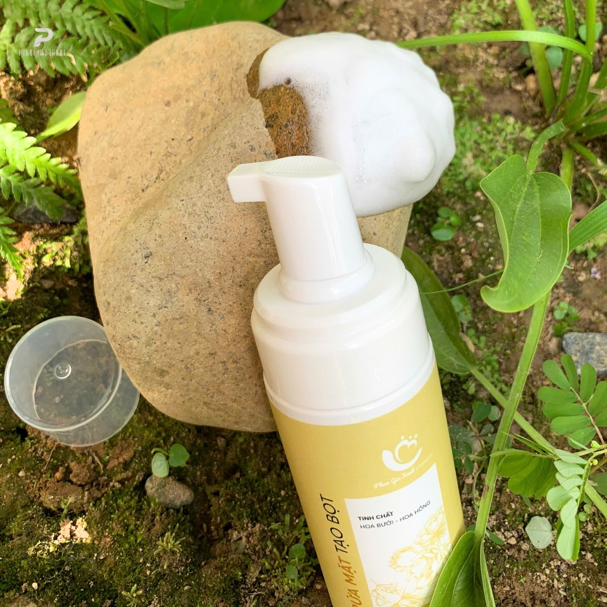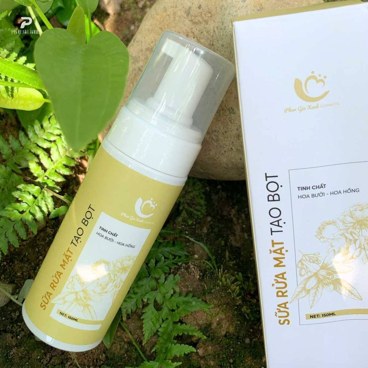 Sữa rửa mặt bọt Phan Gia Xanh làm sạch dịu nhẹ, dưỡng ẩm, hỗ trợ phục hồi, phù hợp da nhạy cảm, mang hương hoa bưởi thư giãn mỗi ngày.