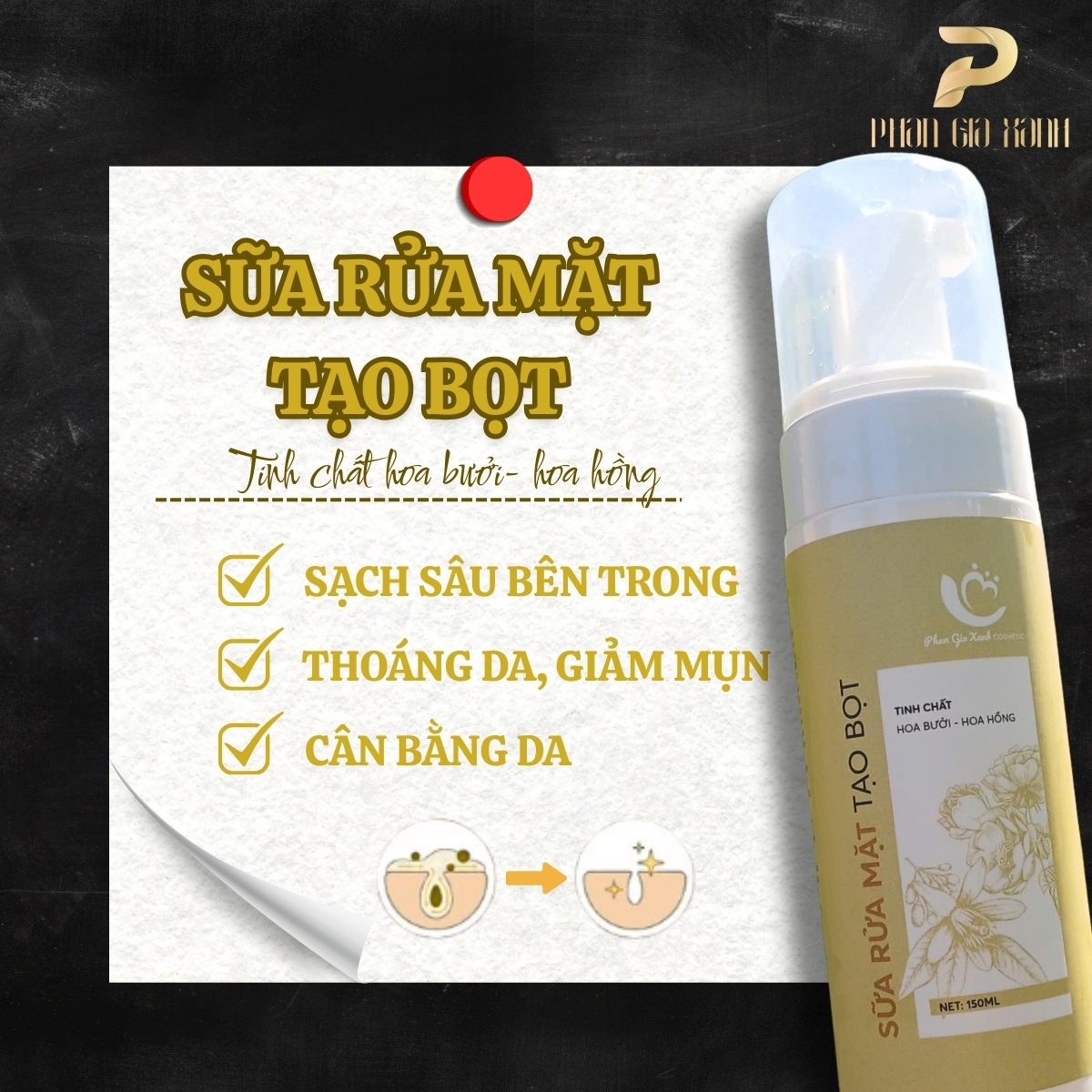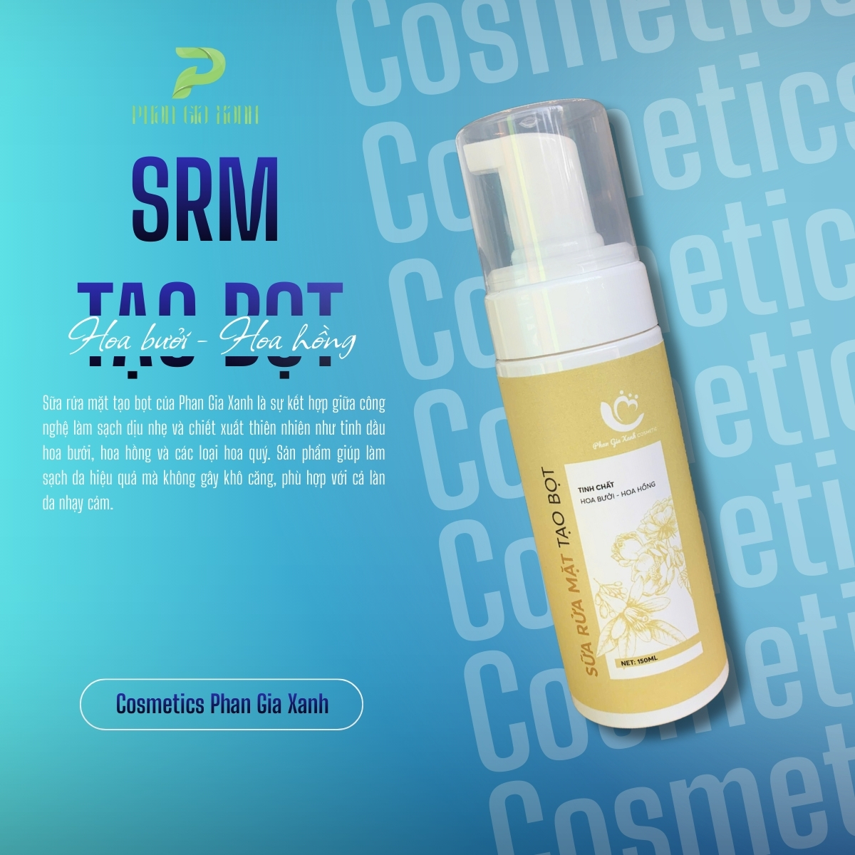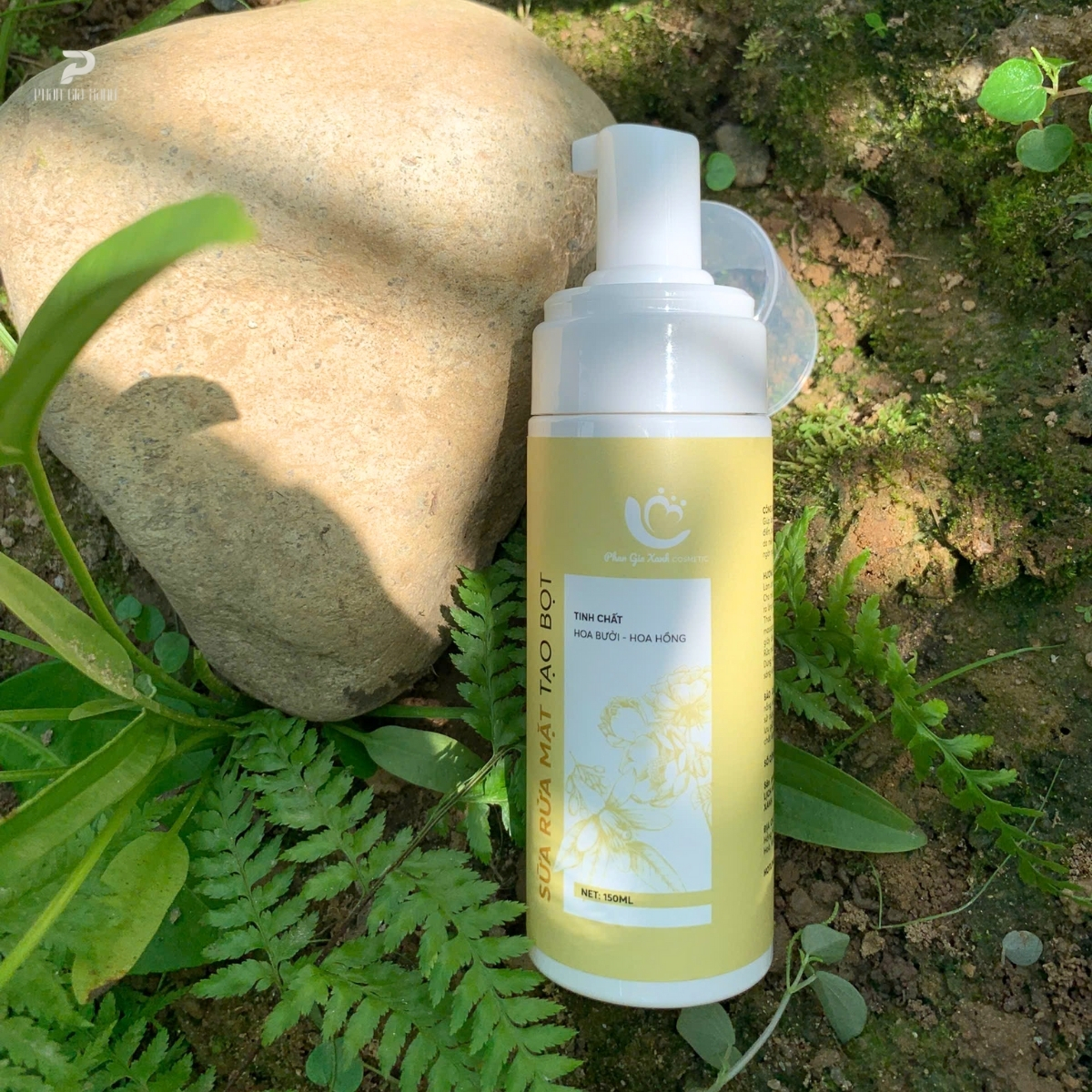 Sữa rửa mặt bọt Phan Gia Xanh làm sạch dịu nhẹ, dưỡng ẩm, hỗ trợ phục hồi, phù hợp da nhạy cảm, mang hương hoa bưởi thư giãn mỗi ngày.